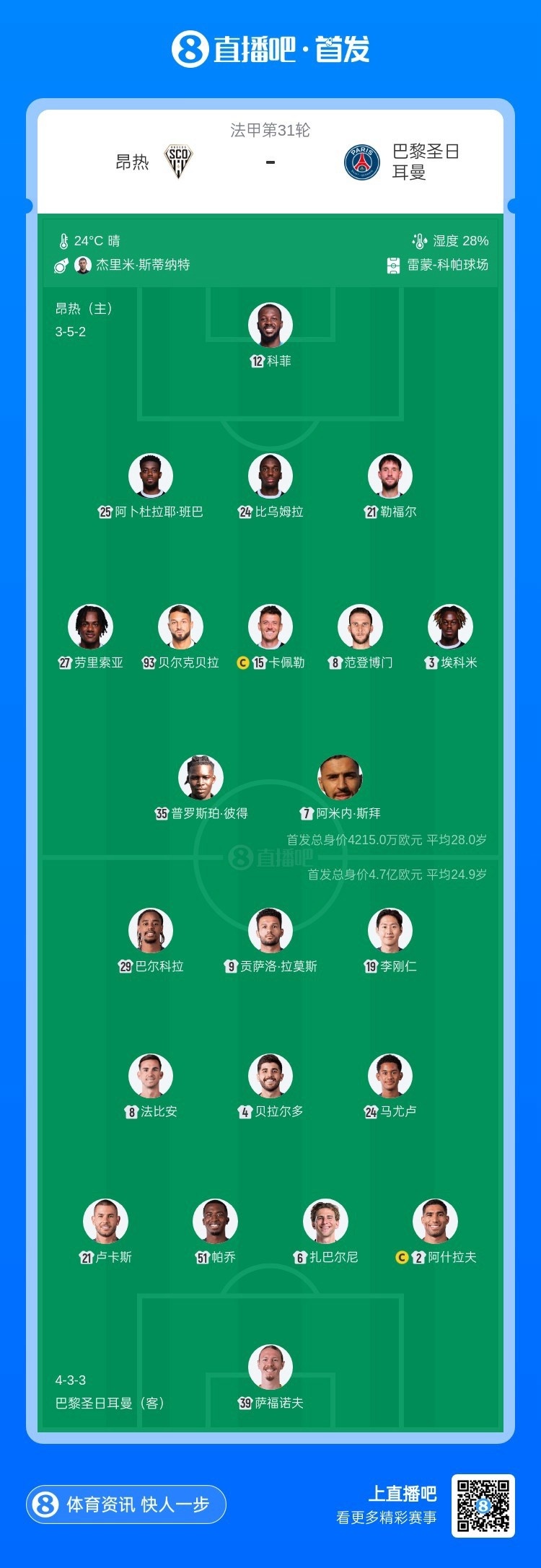 4月26日讯 1点,法甲第31轮,巴黎客战昂热,此役双方首发已经公布。